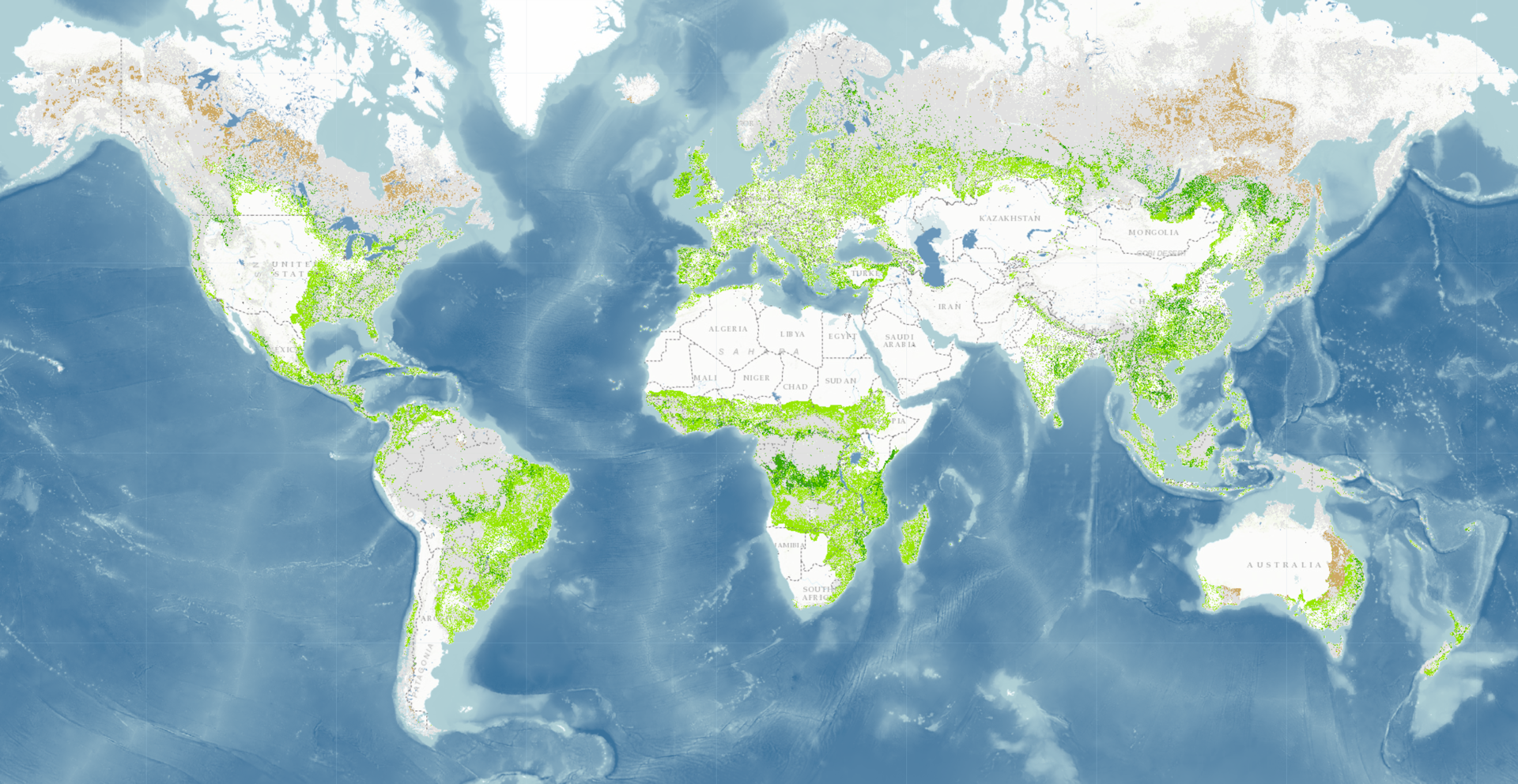 The World Resources Institute mapped deforested areas that offer opportunities for forest restoration. Dark greens are areas ripe for wide-scale restoration. Light green areas could be restored in a mosaic of patches. Grays are current forests. World Resources Institute[10]