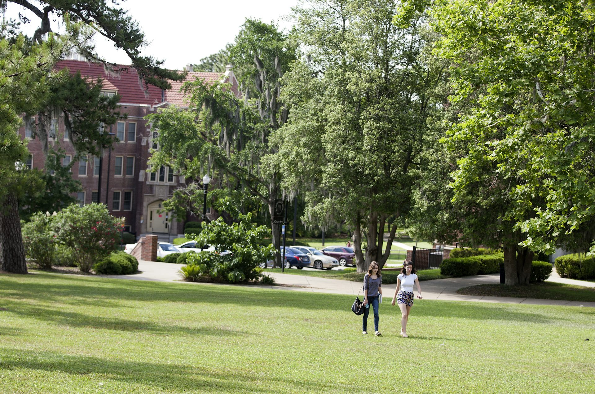 Two students walk across an open space on a college campus.
