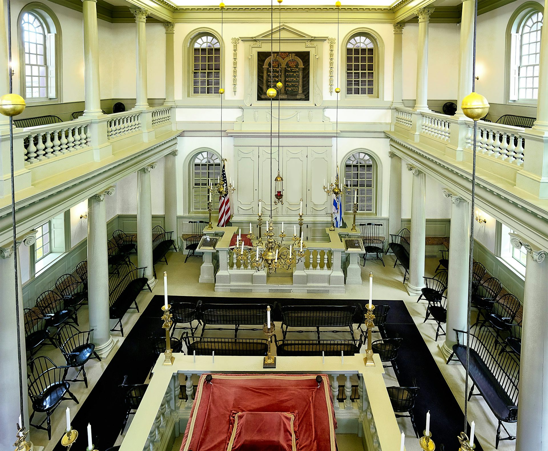 A narrow sanctuary with two floors of seating, painted white. Touro Synagogue in Newport, R.I., built in the 1760s. S.d.touro/Wikimedia Commons[16]