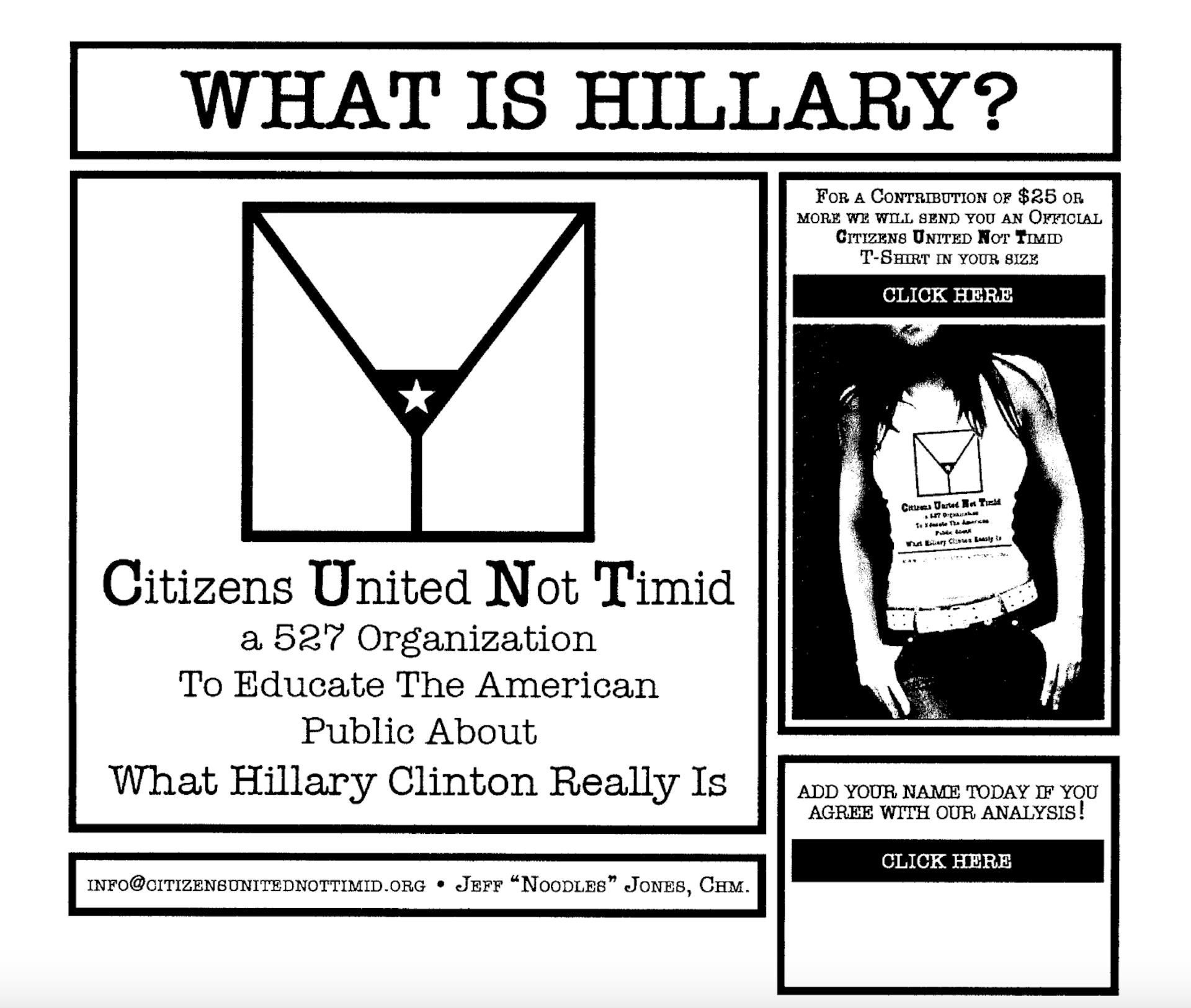 In 2008, Trump’s friend, associate and future campaign strategist[14] Roger Stone launched a PAC[15] called “Citizens United Not Timid: a 527 Organization To Educate the American Public About What Hillary Clinton Really Is.” The important letters were bolded on the image Stone emblazoned on T-shirts: “C-U-N-T.”