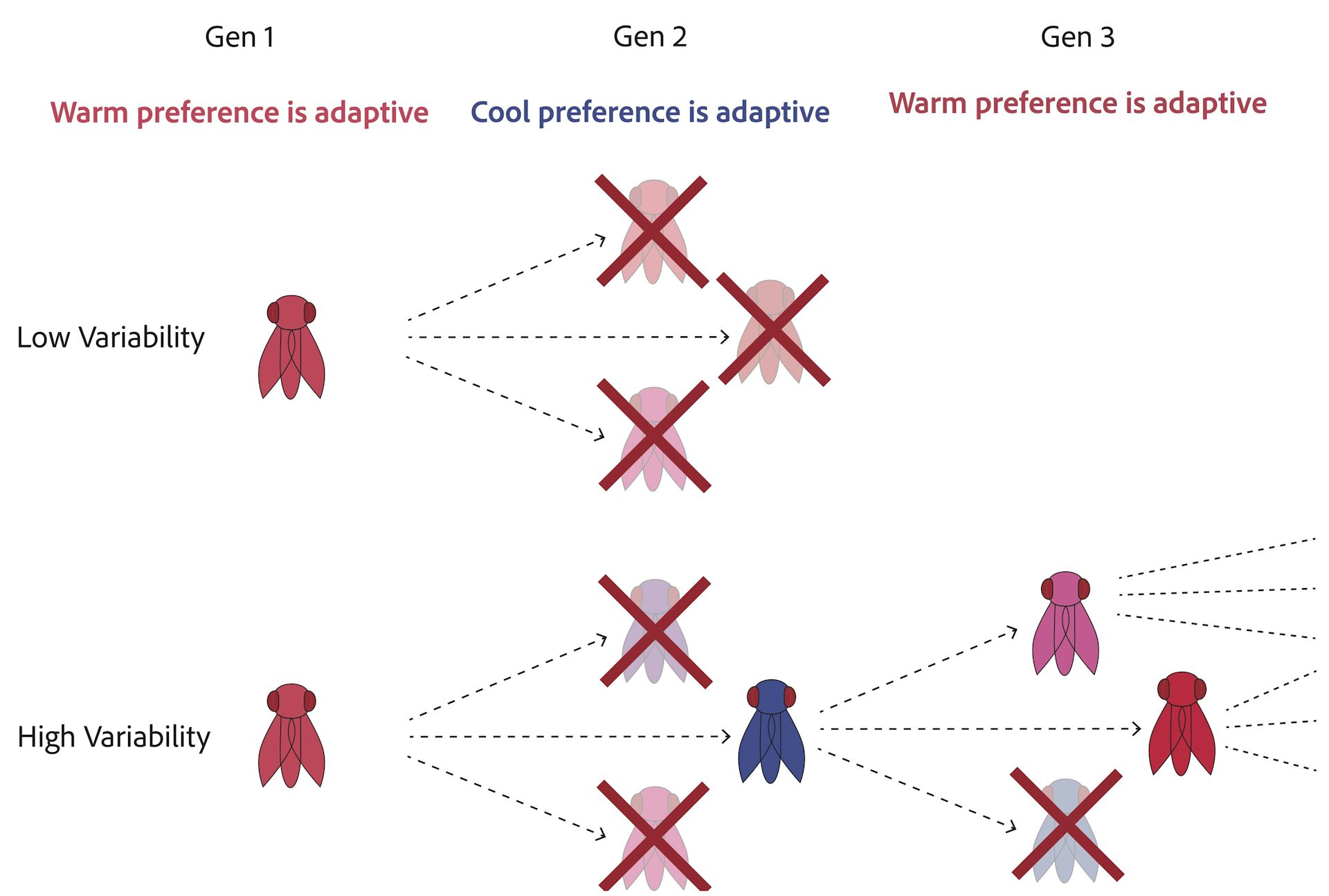 When the environment has average, stable temperatures, the preference of some animals with the high-var gene may be a good fit for conditions. They’ll be able to reproduce, but many other high-var individuals may not.