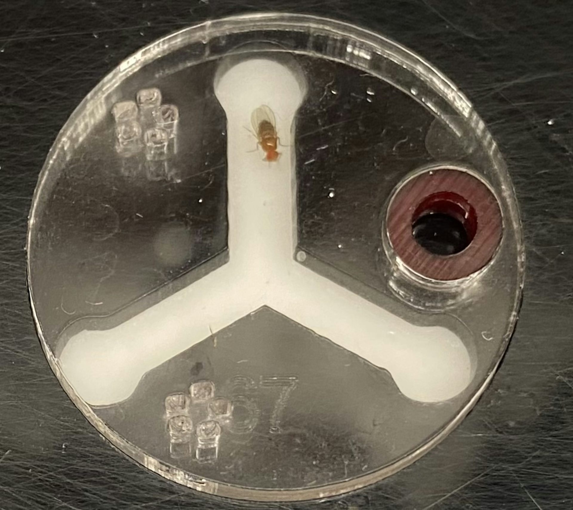 So each day in the lab began with using a thin paintbrush to lift a single, anesthetized fruit fly and transfer it into a simple maze. After it woke up and had explored the maze, I’d place the fly – careful not to let it escape in transit – back into a tube where it could eat and hang out while I decided its fate.